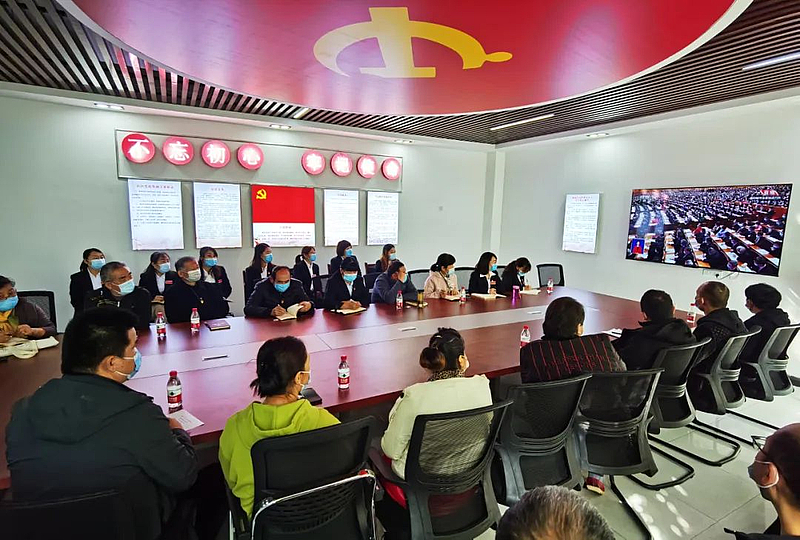 阳光社区党员干部及群众代表在社区党员活动室观看中国共产党第二十次全国代表大会开幕实况。
