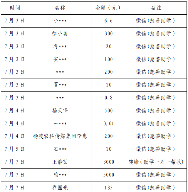 今年的慈善助学募捐活动,还发生和涌现出了好多感人故事及场面,特别是倡议发出后第一个响应的小**,通过微信扫码捐款6.60元,不留姓名,备注的暖心文字是“善意无关金额,爱心自成星河”;爱心人士杨凌蔓阳宝幼儿园的王静茹女士,通过手机银行转账3000元,备注了“一对一帮扶贫困大学生”的暖心文字;爱心人士昀**通过微信扫码捐款5000元,不愿留下姓名,只备注“资助贫困生”的暖心文字;爱心人士张昌生、杜俊飞分别捐款10000元,今年继续资助大学新生,张昌生表示今年要比去年多资助几个大学生;还有政务大厦的一位爱心人士向我会表示到时愿意选一位家庭困难的大学新生进行一对一帮扶资助;特别值得一提的是杨凌欧若拉视光中心的罗海宏女士,多次前来我会洽谈愿意为今年家庭困难的大学新生有需要的进行免费验光并爱心捐赠一副适配眼镜,还在我会设立“慈善护眼专项基金”5万元,定向用于杨凌城乡困难家庭的青少年学生近视、远视、散光等方面的公益科普、免费资助、慈善救助以及对当年大学新生开展近视、弱视免费检查、验光、配镜及第二次配镜等活动;还有西安市杨凌商会、杨凌企业家协会等正在带头捐赠和按系统按行业积极开展动员活动等等......;目前,8月份我区慈善助学募捐活动仍在有序进行之中。下面就7月份社会捐赠情况,特别是慈善助学捐款明细按时间顺序公布如下: