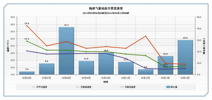 9月6日-14日,杨凌地区共出现大雨2天、中雨4天、小雨3天,最大日降水量41.1毫米。逐日降水量如图1所示: