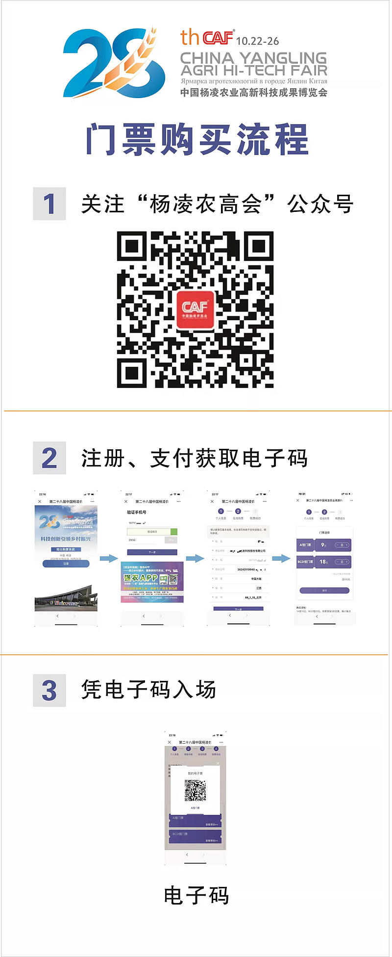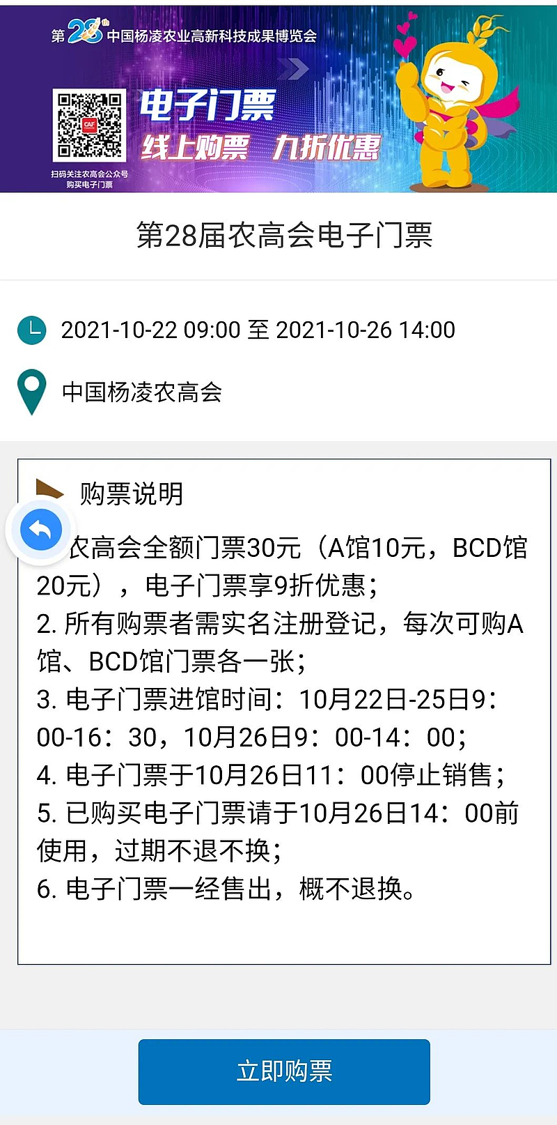 打开“秦务员”APP首页,进入【第二十八届中国杨凌农业高新科技成果博览会】后,点解点击【立即购票】即可购买本届农高会电子门票。