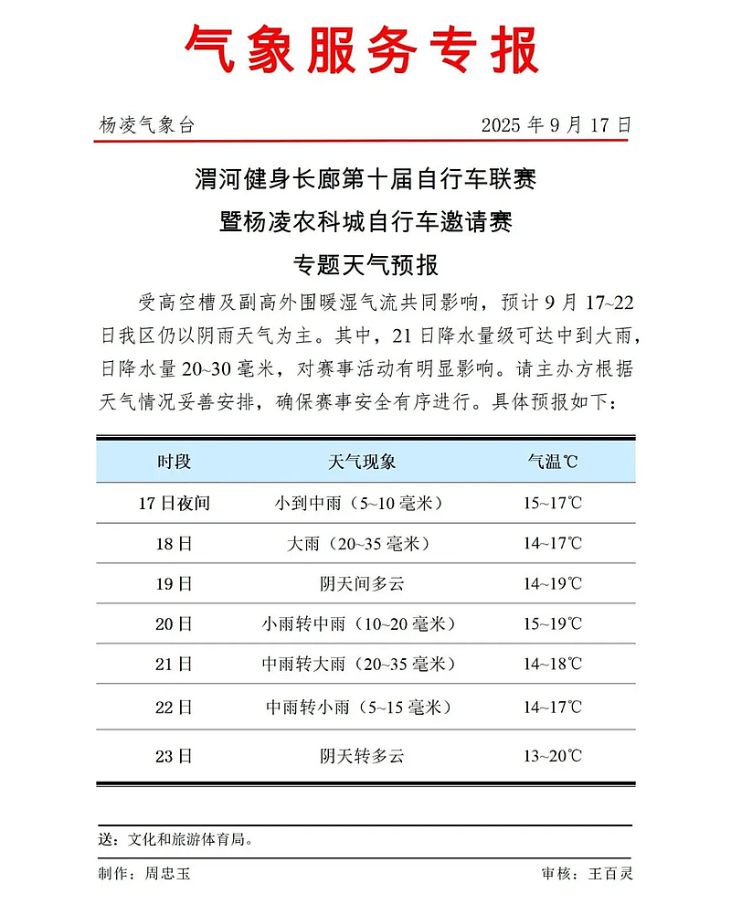 根据气象部门最新预报,原定比赛日(9月21日)杨凌地区将出现明显降水天气,可能对赛事安全及举办效果造成较大影响。为切实保障参赛选手人身安全和赛事整体顺利,经组委会审慎研究,决定将本次赛事延期至2025年10月12日举行。