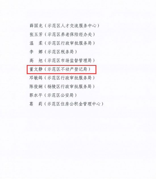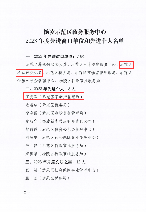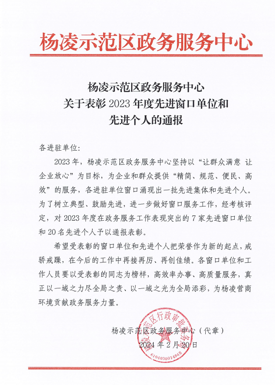 近日,杨凌示范区政务服务中心召开2023年度政务服务工作表彰大会,印发了《关于表彰2023年度先进窗口单位和先进个人的通报》,决定对2023年度在政务服务工作中表现突出的7家先进窗口单位和20名先进个人予以通报表彰。其中,杨凌示范区自然资源和规划局(不动产登记局)被评为“2023年先进窗口单位”,王党军同志被评为“2023年先进个人”,董文静同志被评为“2023年月度文明之星”