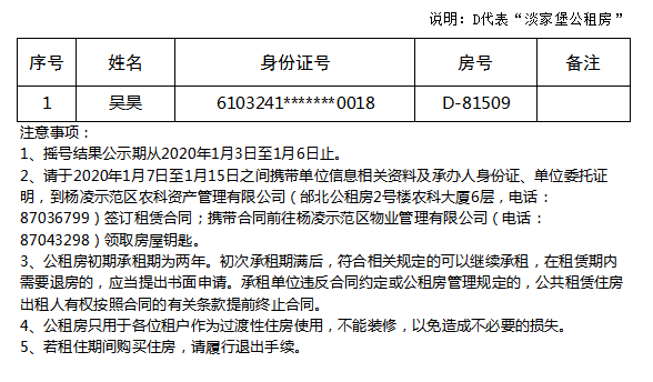 杨凌农信互联数据科技有限公司申请公租房配租结果公示-企202001