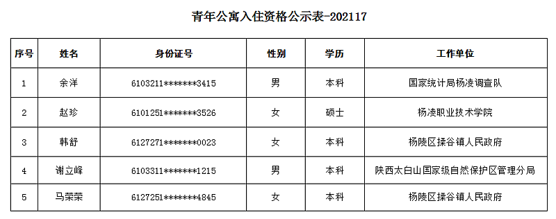 根据《杨凌青年公寓管理办法》和申请人递交资料先后顺序,经杨陵区、示范区两级保障房管理部门审核,现将杨凌青年公寓申请人员入住资格进行公示。公示期限为3天(2021年09月07日-09月09日)。