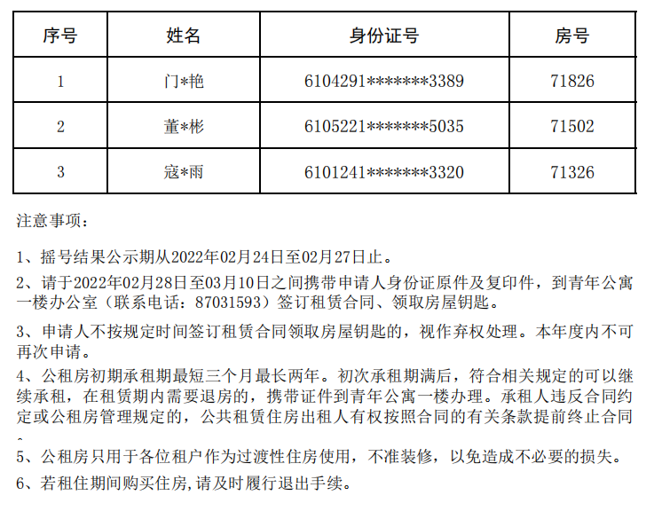 青年公寓摇号配租结果公示—202201